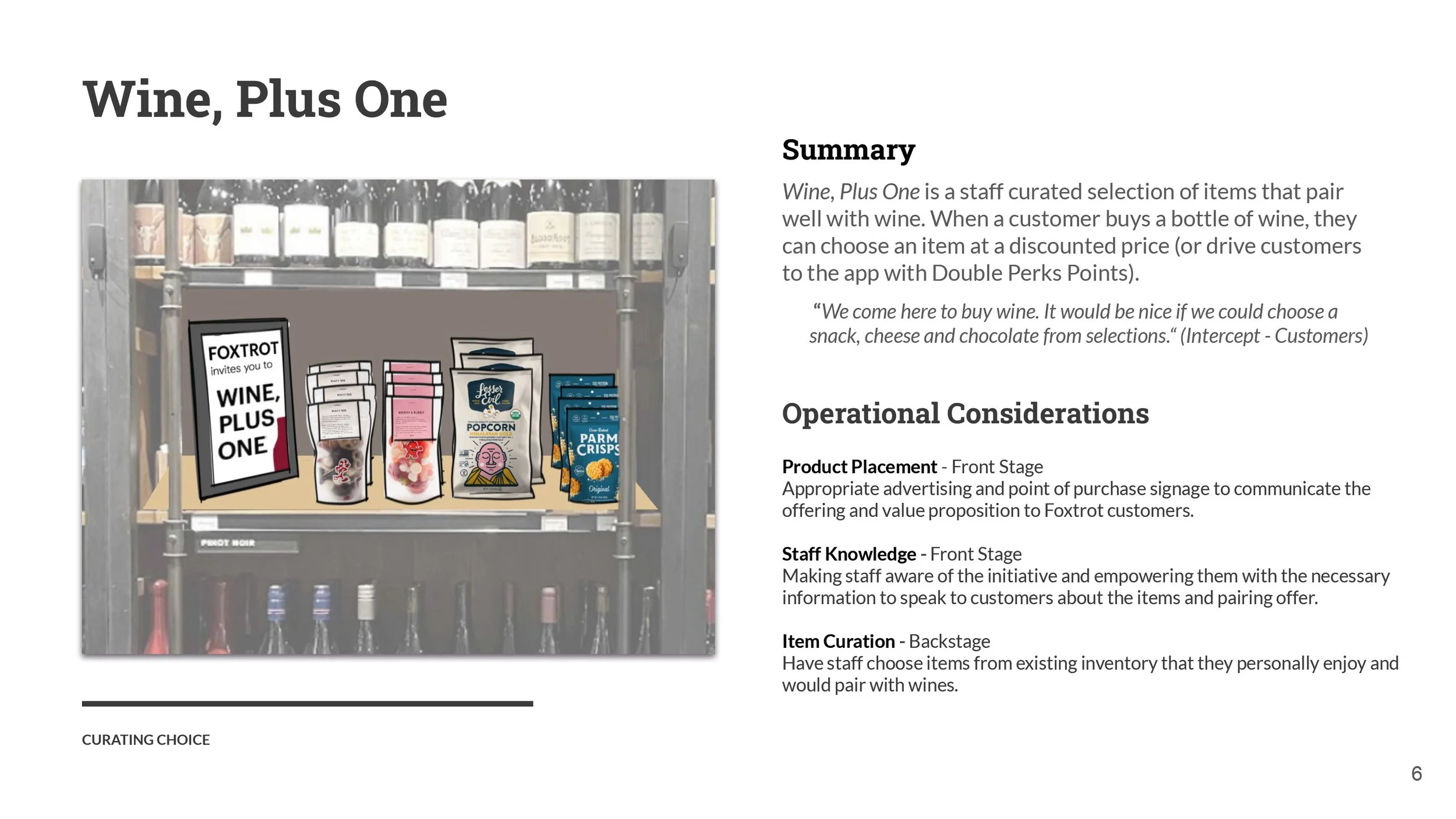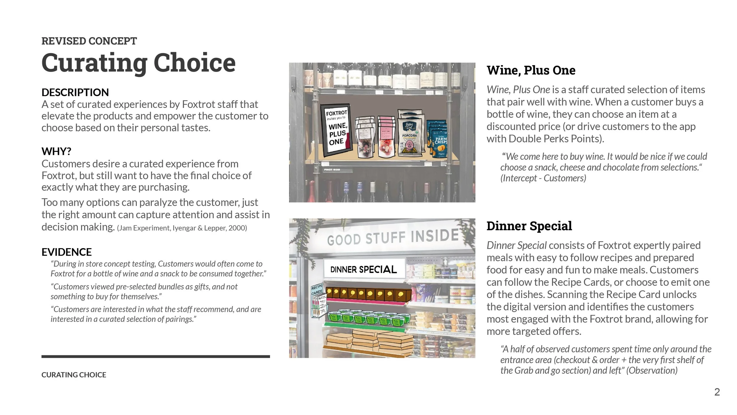 Solution: "Wine plus One," which assists customers in selecting a snack from a curated selection, and "Dinner Special," which assists customers in selecting all necessary ingredients for dinner on a single shelf