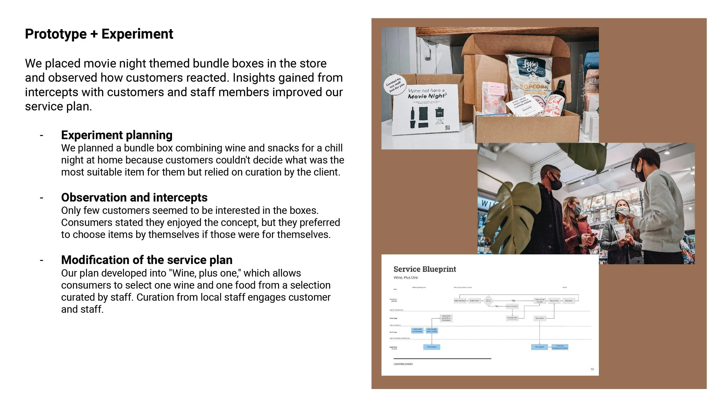 We focused on learning if our concept worked rather than visual communication throughout the in-store experiment. As a result, customers barely grabbed a box. We would have discussed this with the client in advance to connect a presentation with the client's brand concept while also making it visually appealing.